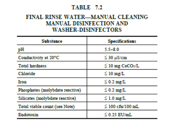 Over the past decade, two standards have covered the production of CSSD compliant water – AS4187:2014 for hospitals and AS4815:2006 for office-based healthcare settings. The AS4187:2014 standard was amended in May 2019 to update the water quality for washer disinfectors (table 7.2) and outline the required water quality for a dedicated steam generator for steam sterilisers (table 7.4). The amendment also included table 7.3 which outlined the microbial quality for the final rinse water in washer disinfectors.