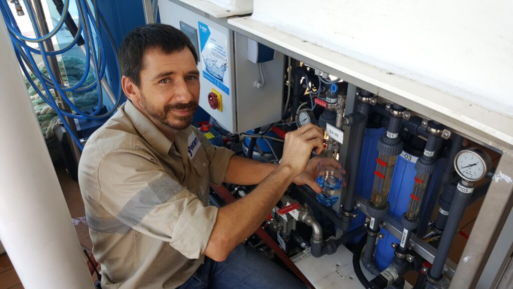 Reverse osmosis systems are no harder to maintain than ship engines. Maintenance of the water treatment system will be covered by the maintenance schedule covering the plant room. Smaller systems, such as those on yachts, can be readily maintained by the crew. Maintenance activities will generally focus on ensuring the membrane is rinsed and preserved when not in use and ensuring correct pump operation. Given the shipboard desalination system is the sole source of freshwater generation at sea, it is important the system is designed to be reliable and built from high quality parts.